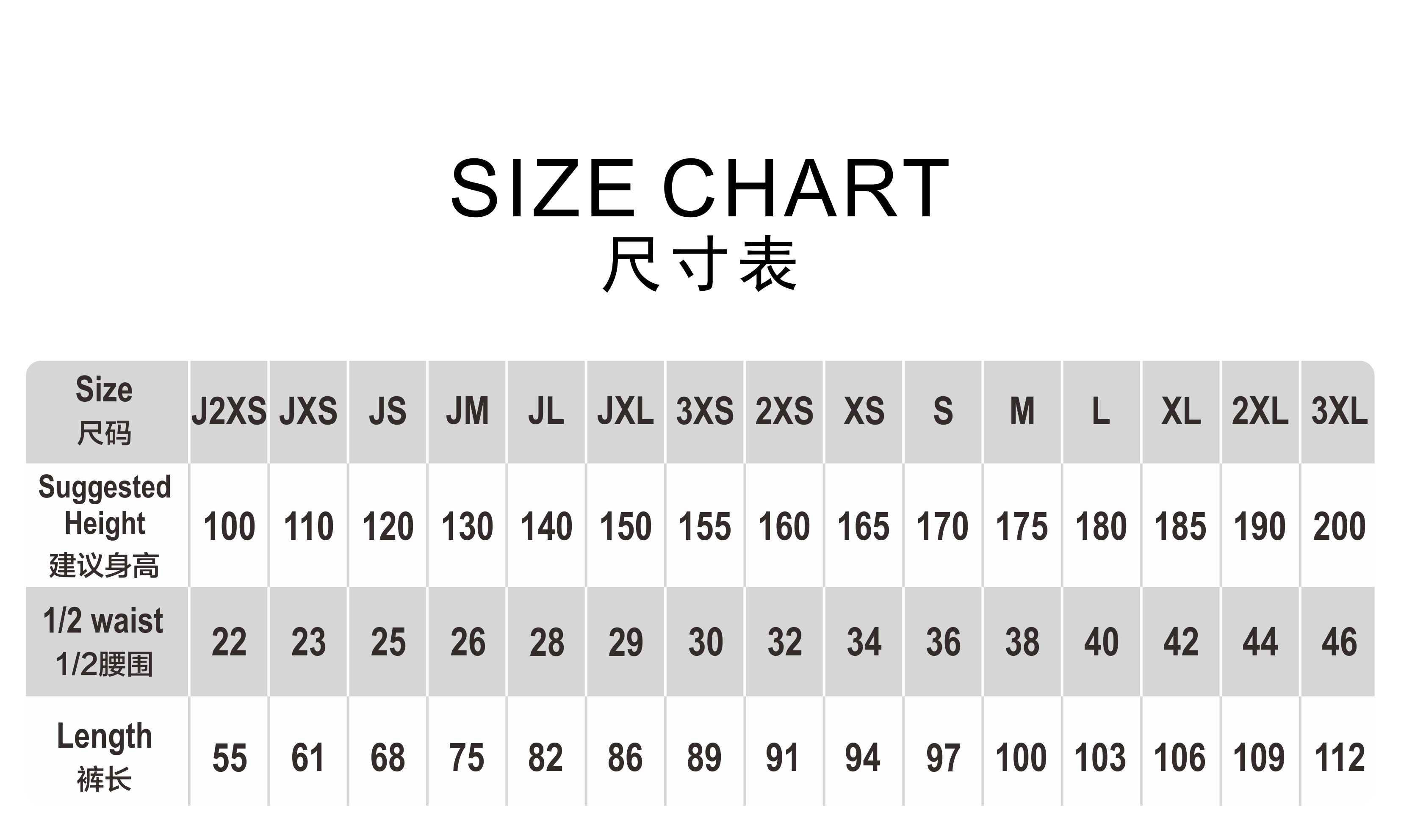 No drawstring for shorts size: J2XS/100~JXL/150。