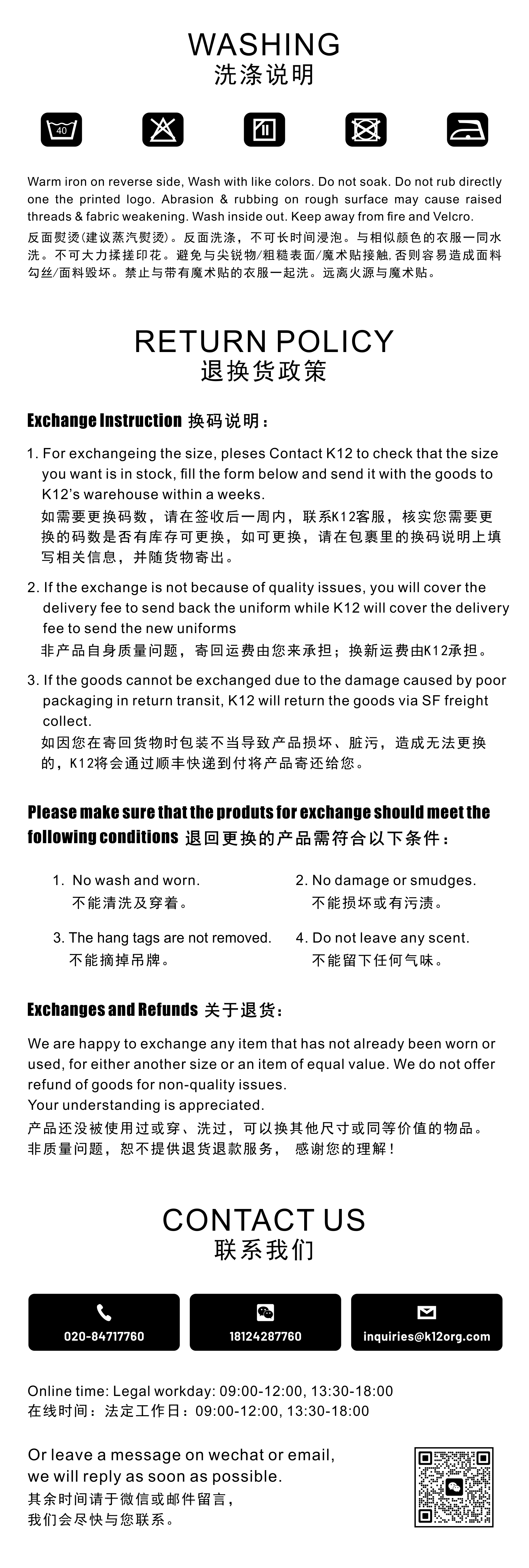"content": " 新款校服启用后,旧生可继续穿着旧款校服。++Existing students can keep wearing the old uniforms after the new ones are implemented.++++清仓商品恕不支持退货;如需换码,请先联系K12客服咨询是否有库存可更换。++Please note that clearance items are non-refundable. lf you need a size exchange, please first contact K12 Customer Service to check if there is any stock available for replacement."